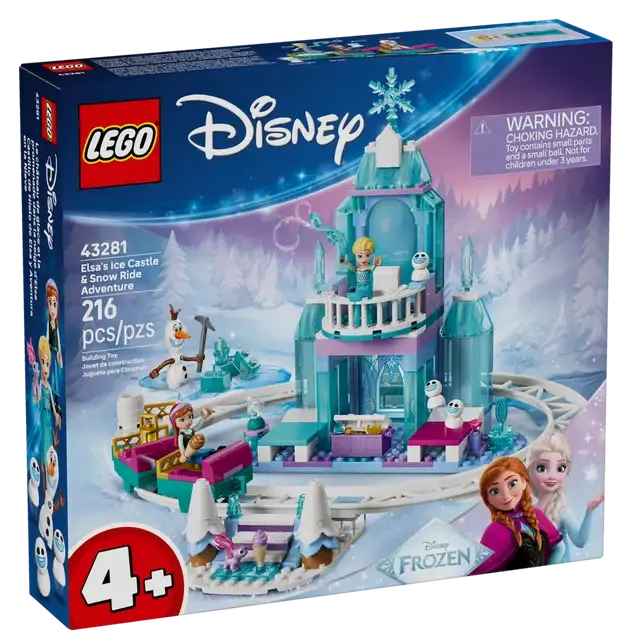 - Zamek z torem i saniami — zestaw konstrukcyjny Lodowy zamek Elzy i śnieżna przejażdżka (43281) zawiera siedem figurek LEGO® ǀ Disney Kraina lodu, dwupiętrowy zamek, tor z trojgiem sań, schody i wiele innych elementów