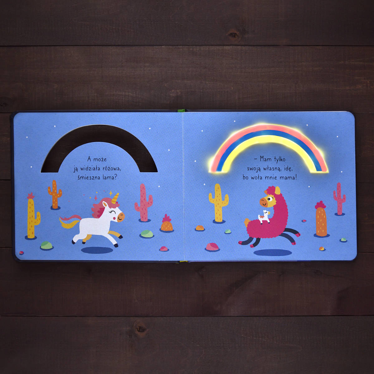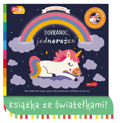 Książeczka ze światełkami Dobranoc jednorożcu z serii Wieczorynka, opowiada o małym jednorożcu, który nie może zasnąć, ponieważ zgubił swoją ulubioną przytulankę. Odwiedza po kolei swoich przyjaciół by sprawdzić czy któryś z nich nie ma przypadkiem pluszaka. Kolorowa tęcza oświetla mu drogę do innych zwierzątek: narwala, lamy, flaminga, dinozaura i sówek. W końcu znajduje swojego misia i zasypia wtulony w mamusię.