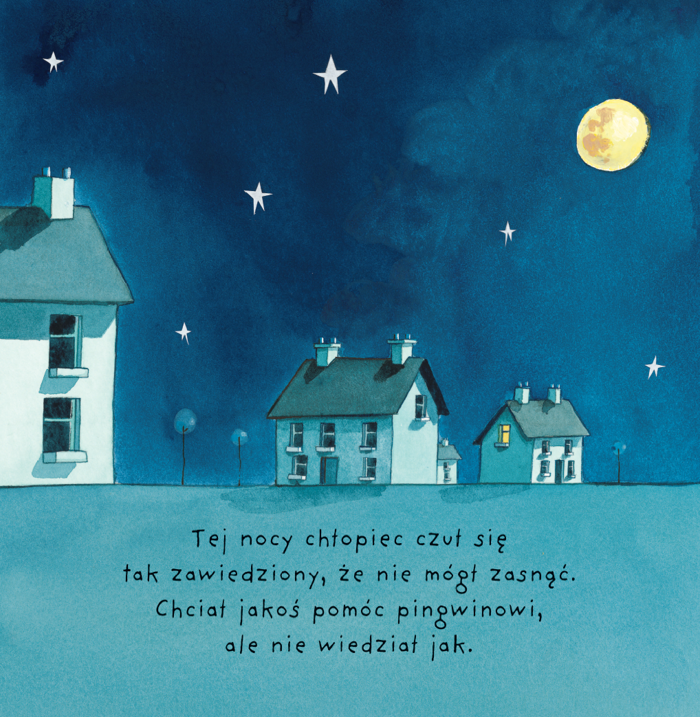 Był sobie raz chłopiec. Pewnego dnia do jego drzwi zapukał… smutny pingwin. Skąd on się wziął? Żeby pomóc pingwinowi wrócić do domu, chłopiec zaplanuje dla nich podróż aż na skuty lodem biegun południowy. I znajdą tam wielki skarb.