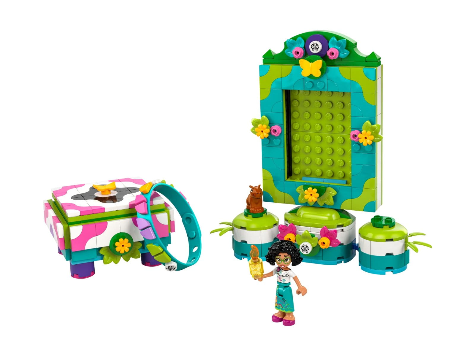 - Ramka na zdjęcia LEGO® — zestaw zawiera małą szkatułkę na biżuterię, ramkę na zdjęcia ze stojakiem i dodatkowymi klipsami, bransoletkę, a także minifigurkę Mirabel LEGO® ? Disney „Nasze magiczne Encanto”