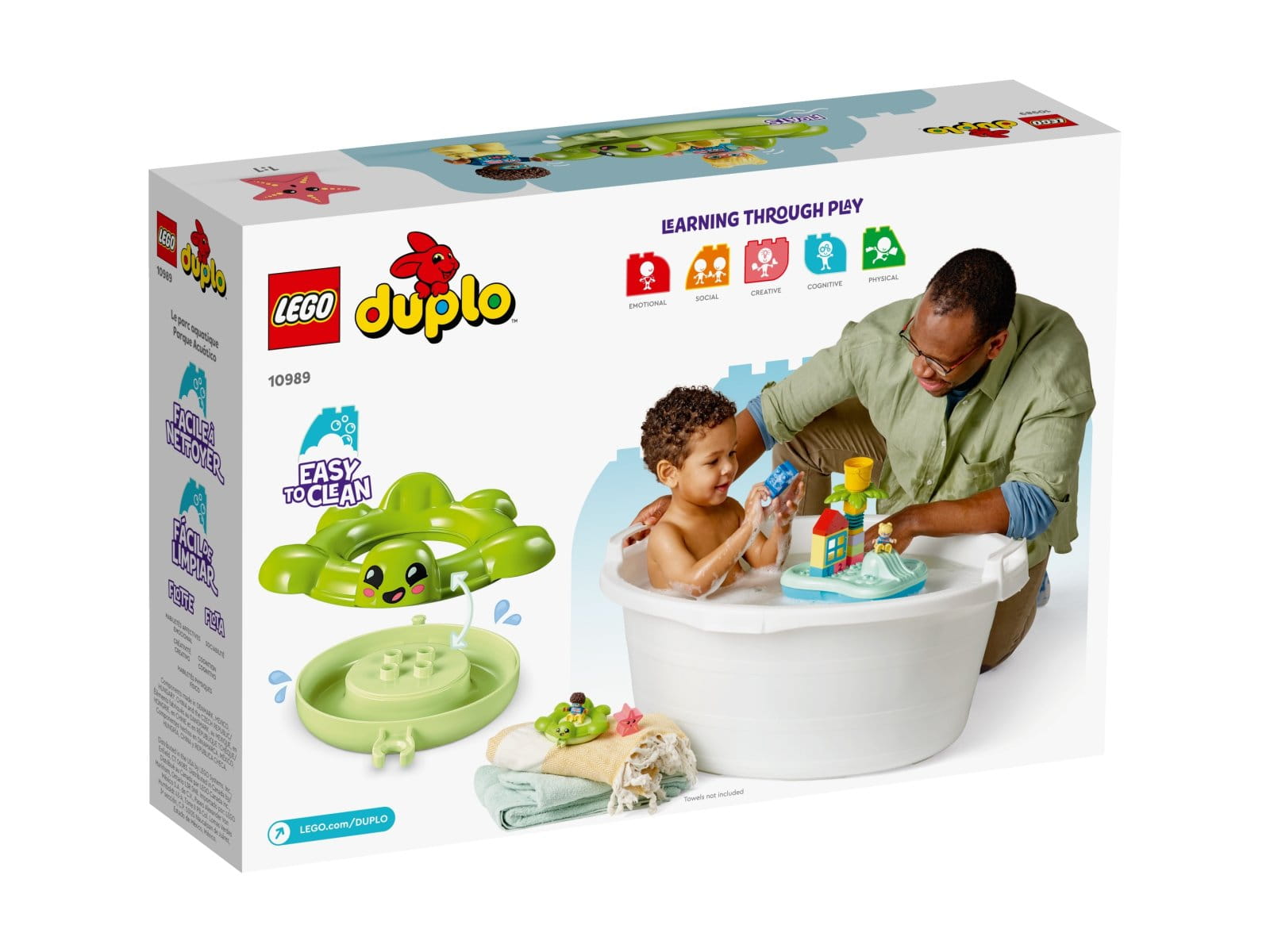 Szukasz zabawki do kąpieli dla maluchów w wieku od dwóch lat? Dzięki LEGO® DUPLO® Town Park wodny (10989) kąpiel zmienia się w pełną nauki zabawę, w czasie której dzieci odkrywają kolorowy park wodny. Ten zestaw nie tylko wprowadza maluchy w świat liczb i rozwija umiejętność nalewania, ale jest też łatwy do wyczyszczenia i przechowywania.