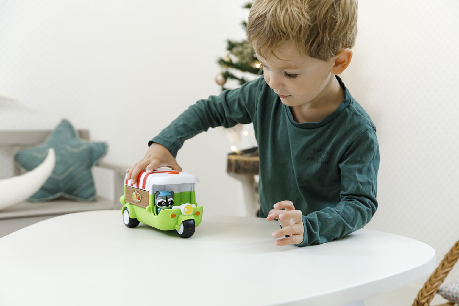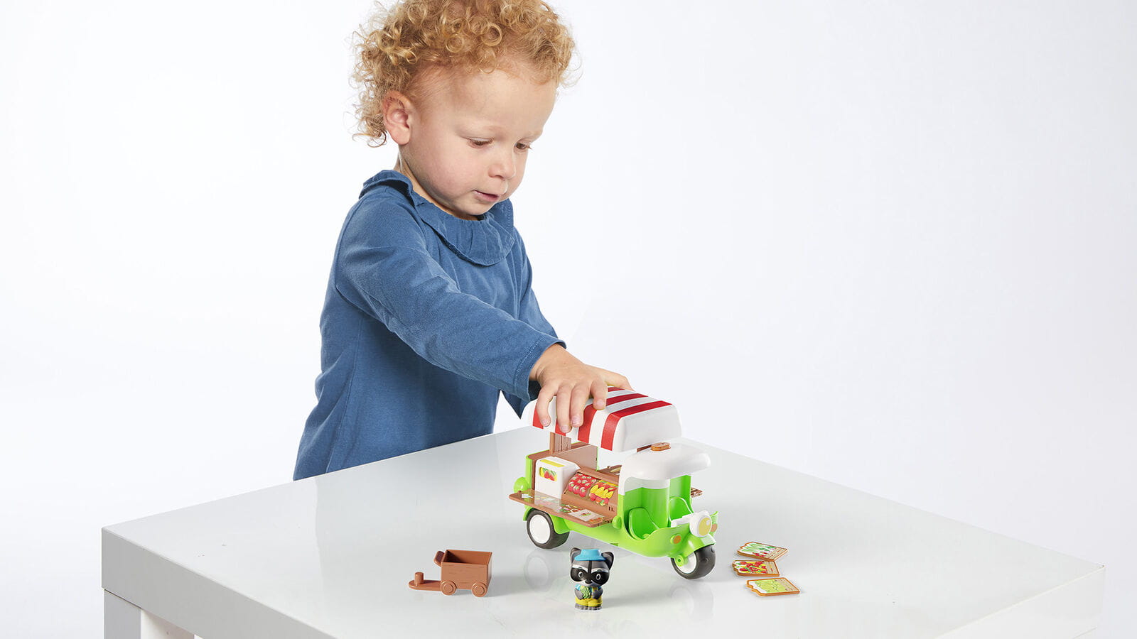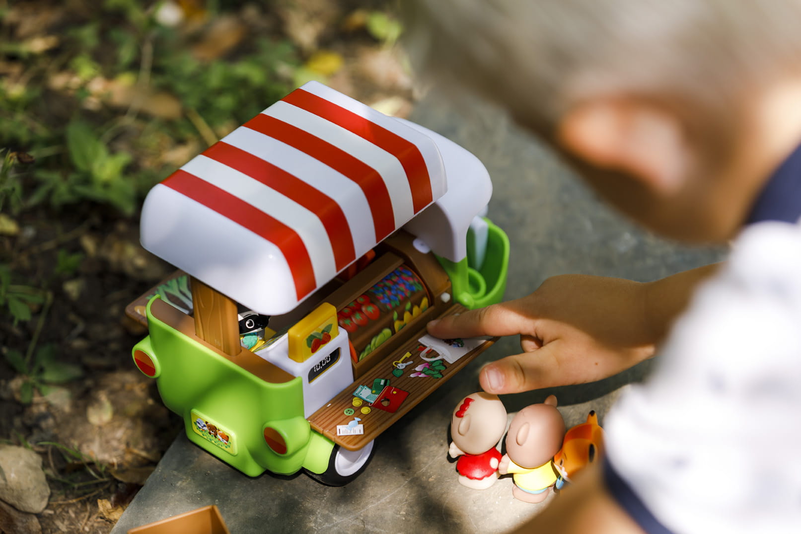 Naciśnij przycisk na szczycie dachu trójkołowca, aby food truck się otworzył. W środku znajduje się wózek na owoce i warzywa. Kasa, która po naciśnięciu przycisku pokazuje cenę zakupów, trzy tabliczki z naklejkami owoców i warzyw. Na blacie są naklejki owoców i warzyw aby wszystko wyglądało realistycznie. W samochodziku jest miejsce dla dla kierowcy i pasażera. Mały klient może zakręcić wałeczkiem aby zobaczyć wybór produktów.