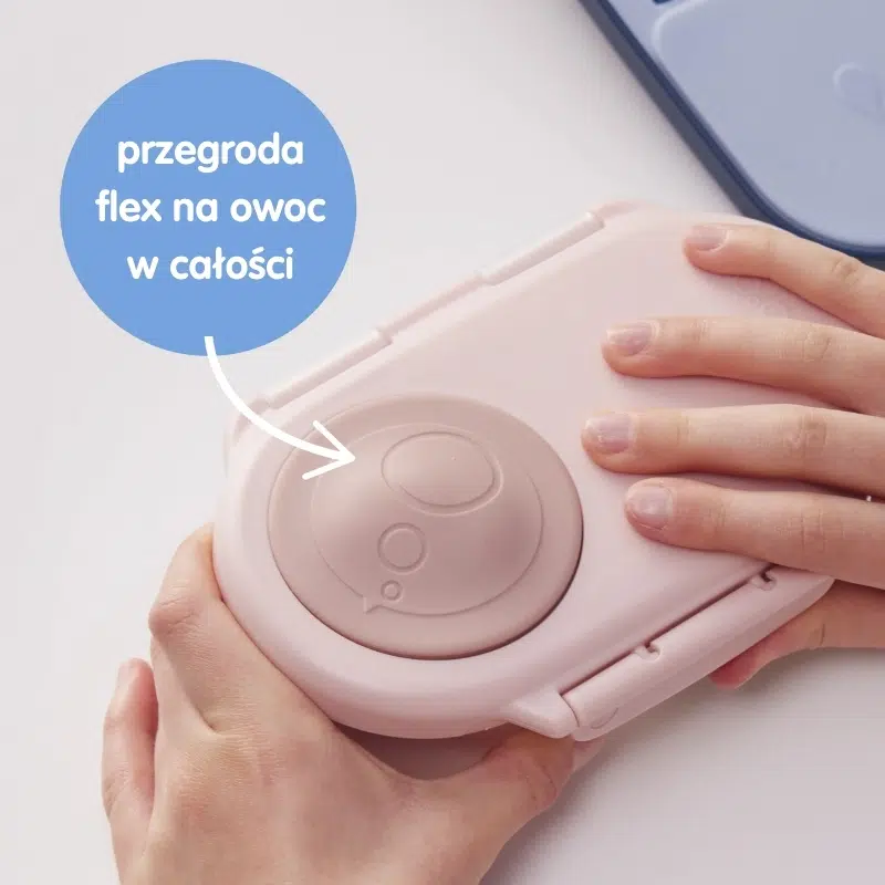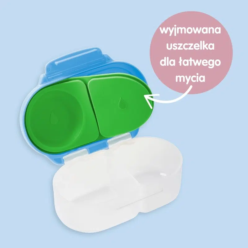 Niewielki pojemniki z przegródkami na przekąski b.box ma wyjątkową silikonową uszczelkę. Zapewnia ona szczelność pudełka i umożliwia zapakowanie do niego ulubionego dipu lub jogurtu z owocami. Pozwala również by w jednej z dwóch części, zamknąć całe jabłko. Jest to możliwe dzięki elastycznej pokrywce flex, którą w tym miejscu tworzy silikonowa uszczelka. Ma ona jeszcze jedną zaletę. Można ją zdjąć i dokładnie umyć oraz wysuszyć. Takie rozwiązanie sprawia, że snackbox jest higieniczny w użyciu.