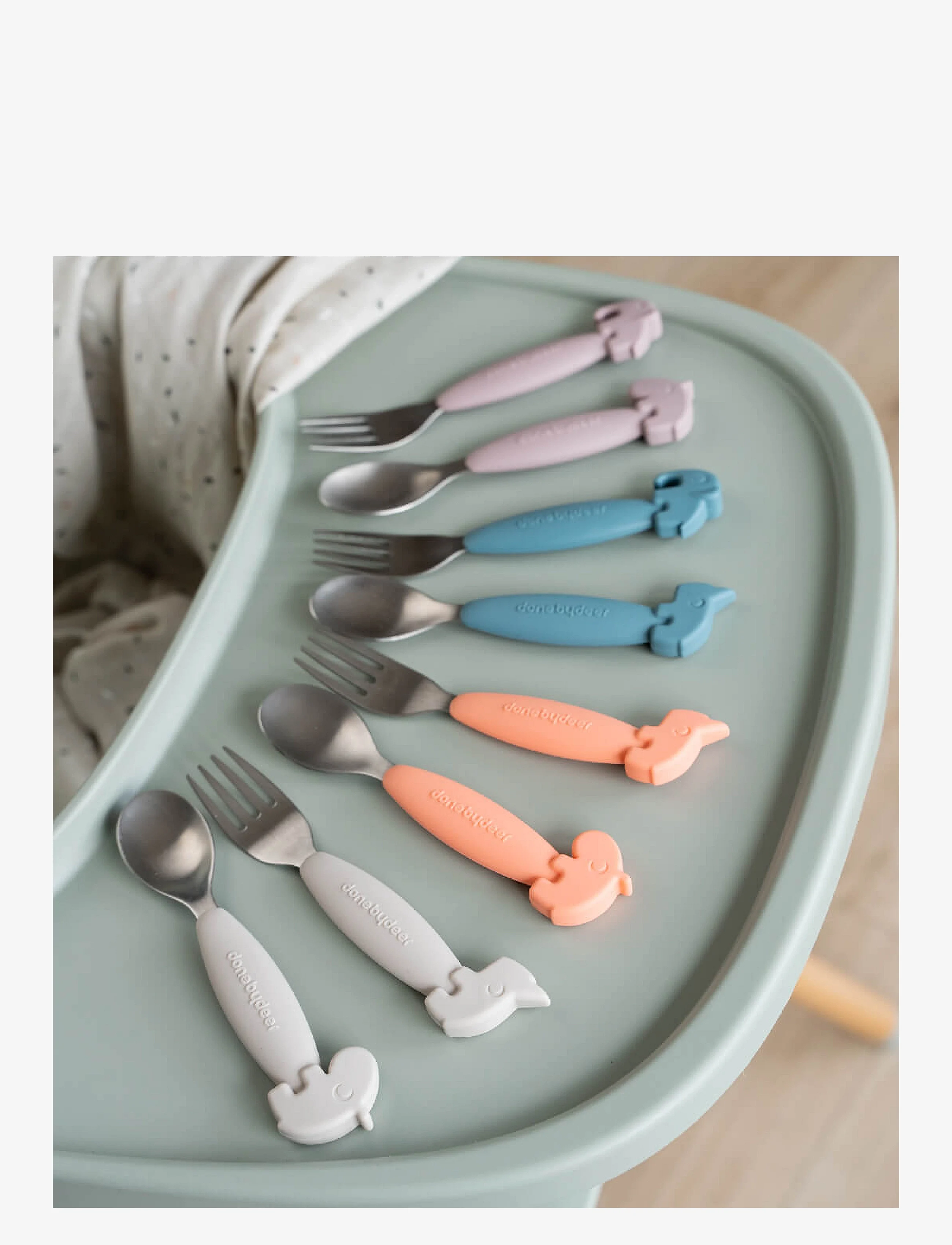 Sztućce dla dziecka z kolekcji Easy-Grip to zestaw składający się z małego widelca i łyżeczki. Sztućce o zaokrąglonych kształtach zaprojektowane zostały z myślą o dzieciach, które dopiero rozpoczynają naukę samodzielnego jedzenia. Niewielki rozmiar sztućców idealnie wpasowuje się w małe rączki dzieci zapewniając im wygodę i komfort podczas posiłku. Posiadanie sztućców dopasowanych do małych rączek jest niezwykle pomocne w nauce samodzielnego jedzenia. Urocze sztućce mają miękkie silikonowe antypoślizgowe uchwyty dzięki czemu staną się ulubionym zestawem twojego dziecka. Widelec Nozo i łyżka Elphee pasują do całej kolekcji zastawy stołowej Done by Deer. Materiał: stal nierdzewna, uchwyt: silikon spożywczy Wymiary: wysokość: 14,4 cm Czyszczenie: Można myć w zmywarce do 70°C. Nie używać w kuchence mikrofalowej. Done By Deer to Skandynawska firma projektująca zabawki z myślą o dzieciach i ich rodzicach. Done By Deer wykorzystuje w swoich produktach skandynawskie wzornictwo. Poprzez kombinację różnych kolorów i materiałów projekty pobudzają zmysły dziecka. Dzięki charakterystycznej grafice produkty mają odniesienie do skandynawskiego stylu życia. Wszystkie produkty Done By Deer są całkowicie przyjazne i bezpieczne dla dziecka.